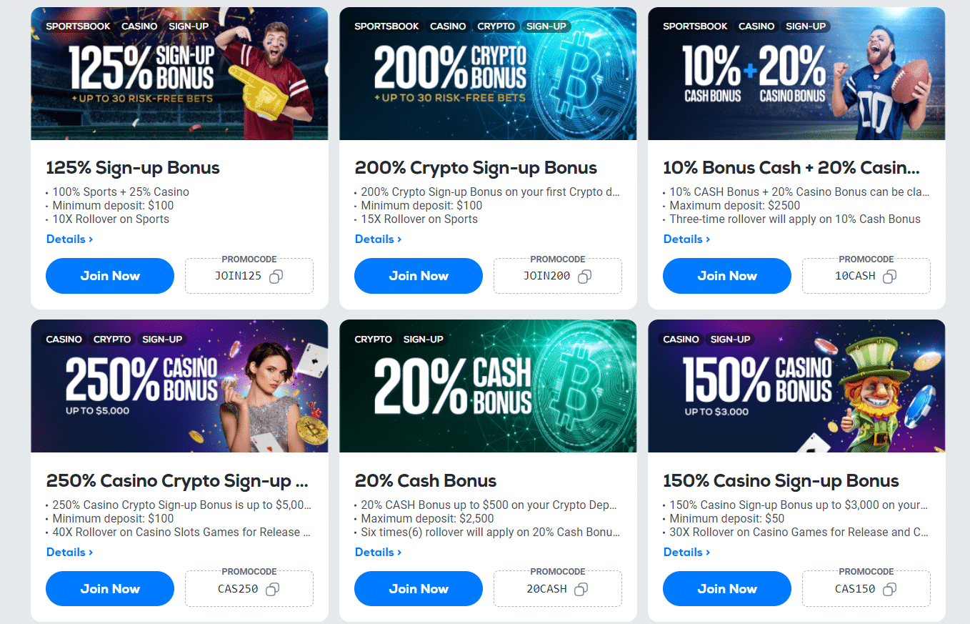 Like we touched upon above, there are multiple BetUS registration promos. Here, we will only get into those that are claimable by sports bettors as well. The first one is a 125% match up to $2,000 across your first three deposits here. It is a deal that requires a minimum qualifying deposit of $100, and is in fact a package of a 100% sports bonus and a 25% casino one up to $625. There’s also a crypto-specific version offering up to $1,500. Each of these expires after seven days and must be claimed using the code JOIN125 within forty-eight hours of your initial platform deposit.