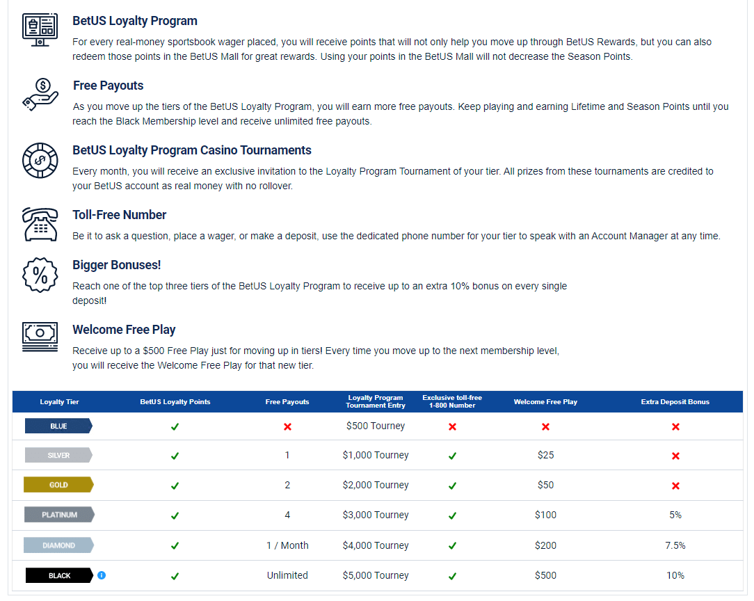 The Black tier supplies entry into a $5,000 casino tournament run monthly, and a maximum 10% deposit boost. We should mention that rewards points can get used in the BetUS Mall; they can get redeemed for merchandise or perks.