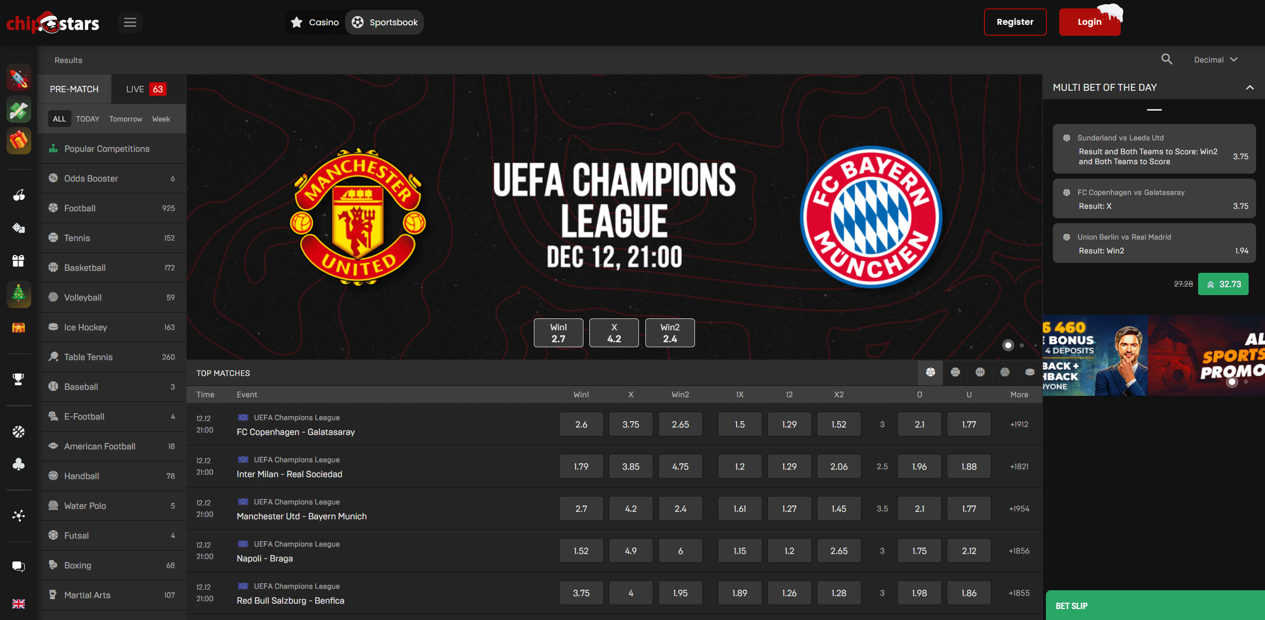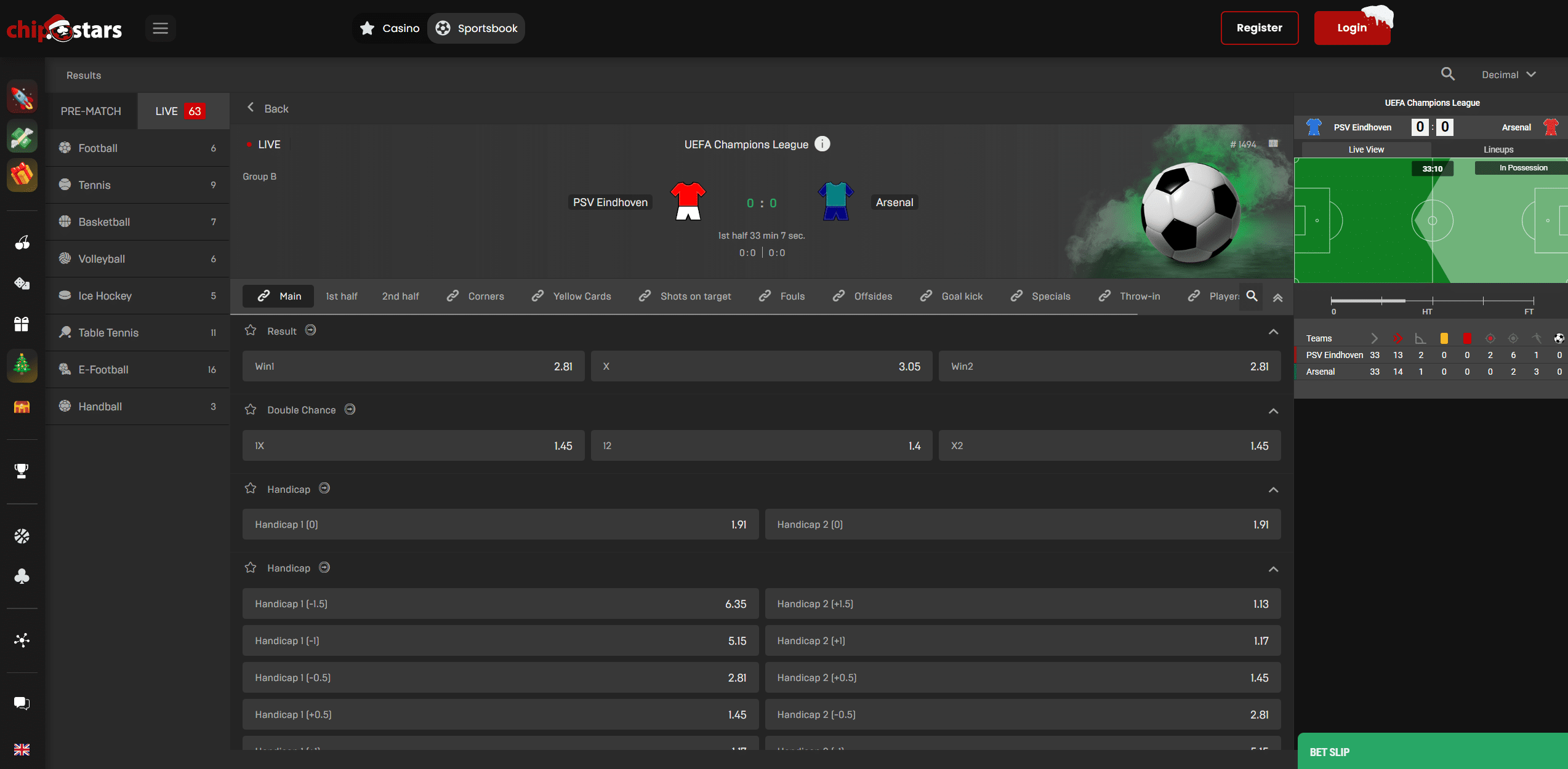The left-hand side menu of the ChipStars betting page is dedicated to the sports categories featured here. The number of available markets is shown next to each sport, and when you click on a sport, a selection of countries/competitions unravels instantly. Clicking on one of these shows sub-groups of competitions, if there are any.