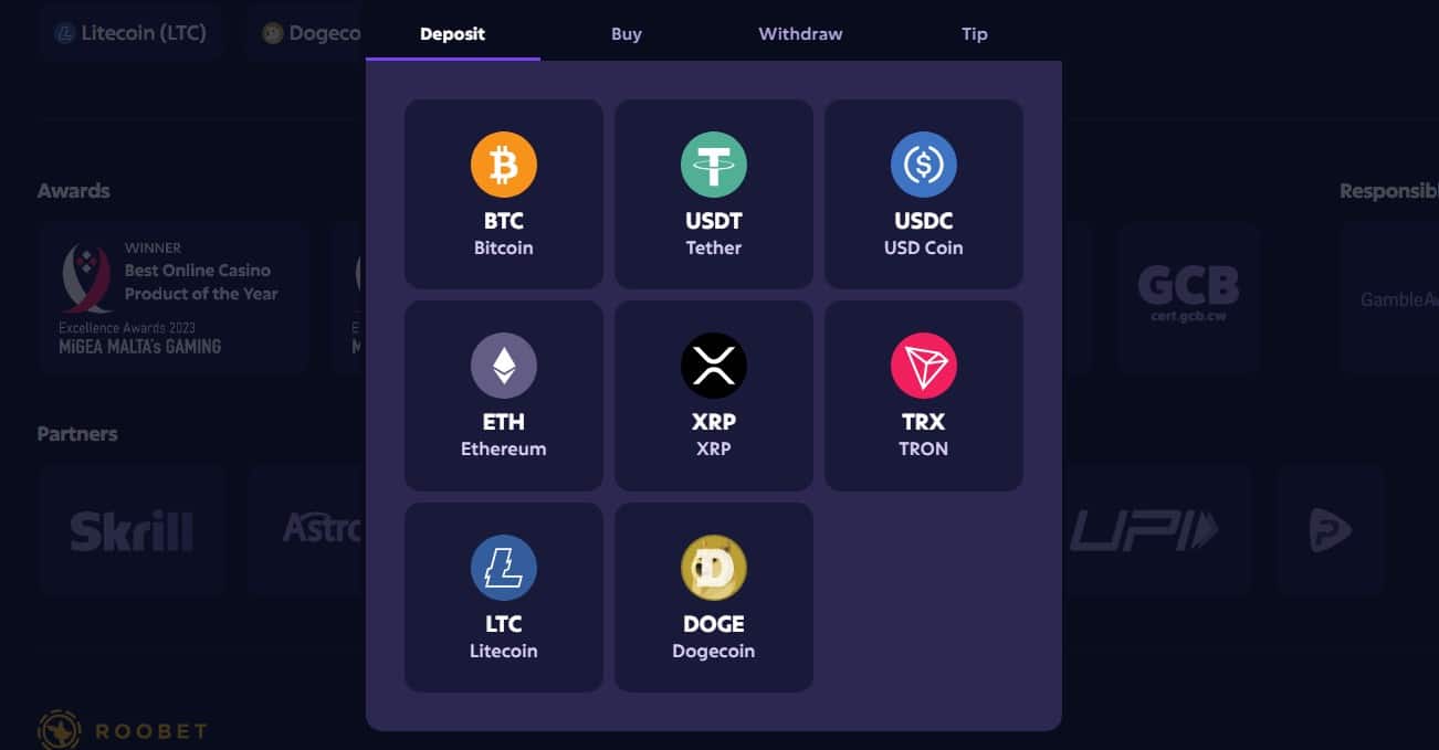 For cryptos, users deposit cryptocurrencies into their Iron Pouch, the name for their site balance, using wallets they own. They choose one of the several accepted coins if they do not prefer to go the fiat route. Once they make their selection, Roobet will give them a network choice, if one is possible, and present them with a QR code or an address to which they can send their funds. The site also allows depositing directly from over three hundred exchanges.