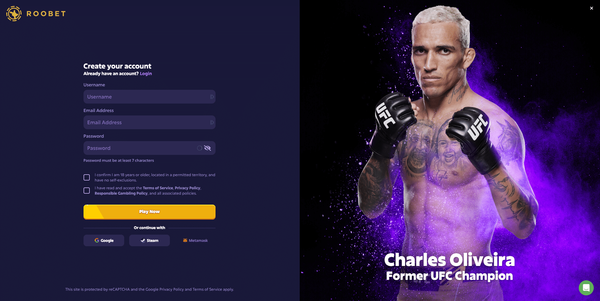 You can become a Roobet gambler by linking your MetaMask, Steam, or Google account, or you can go through the traditional sign-up process which entails you inputting a username, entering an email address, choosing a password that is at least seven characters long, a referral code if you have one, and accepting the Roobet TOS and Privacy Policy by checking a box before hitting the Play Now button.