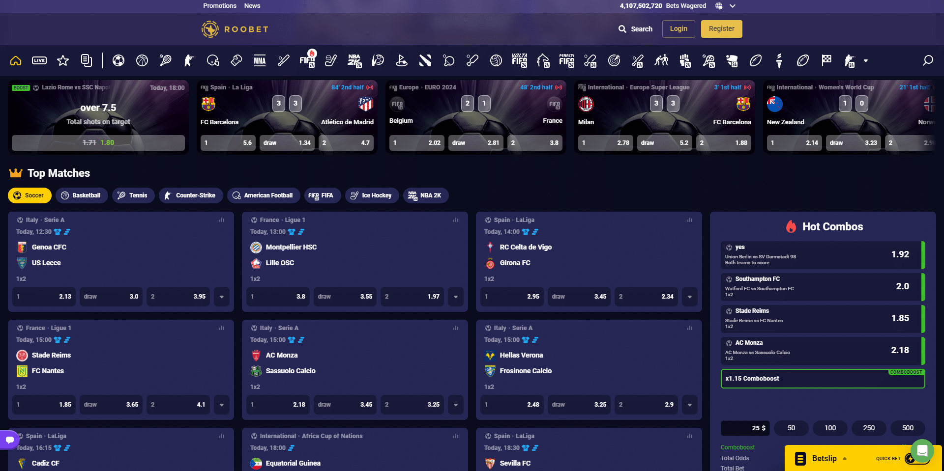To be frank, we are tired of detailing the UI of the BETBY interface. We have done this in over a dozen reviews, and the number of sites that choose this solution keeps growing. What you get at Roobet is no different than the majority of the platforms that have adopted this software. You have a left-hand sidebar providing quick access to a wide range of sports. The central display is dedicated to live and upcoming matches, with scores and match times clearly visible, and main market odds are present in a box in each event card, which are presented in a grid format. How many cards you see depends on your browser zoom level and how you have resized your browser window.