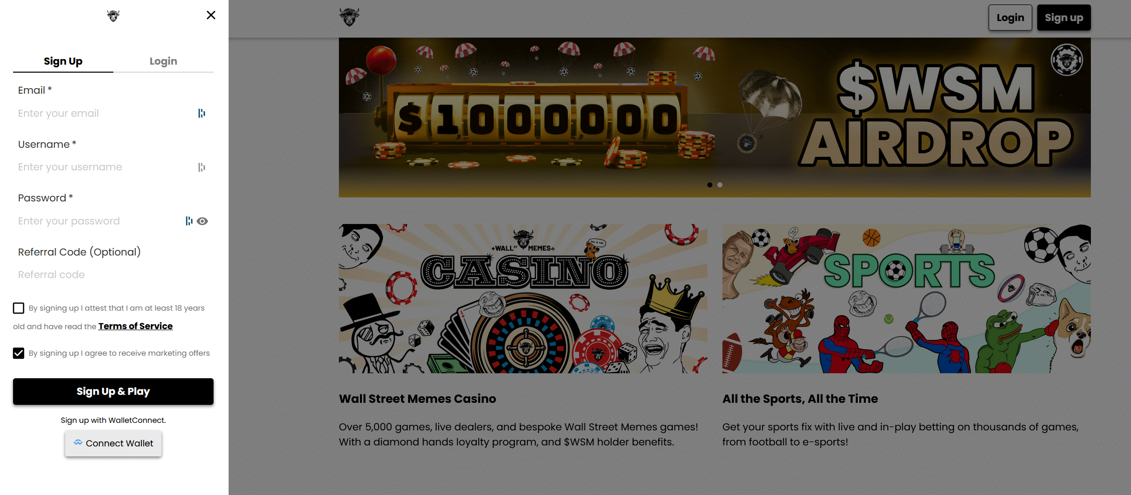 You can hop aboard the WSM Casino train by linking your WalletConnect crypto wallet to this site, which should give you automatic account creation. If you do not have that wallet, you can use a different one and want to go through the standard sign-up route, then you will have to submit your email and enter a username and password while confirming that you accept this hub’s service stipulations.