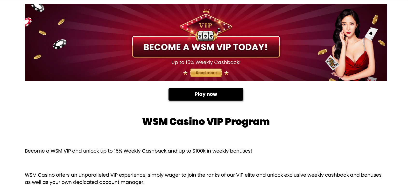 As is now common in the sphere, WSM Casino also lets you transfer VIP status from another site, meaning that by proving that you have shown a high level of activity elsewhere, you will get immediately rewarded with some VIP perks here.