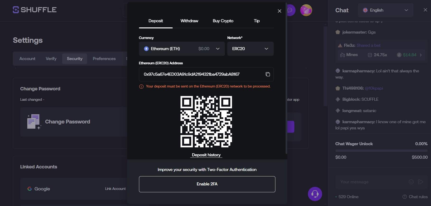 To deposit at Shuffle Casino, you must first verify your account. Only then can you enter your preferred cryptocurrency and make a deposit. Each crypto option has its own associated upper limits, but these generally start at around 0.0001 BTC, 0.001 ETH, 1 USDT and the equivalent in other cryptos. While Shuffle Casino doesn’t charge for deposits, some wallets may choose to do so.