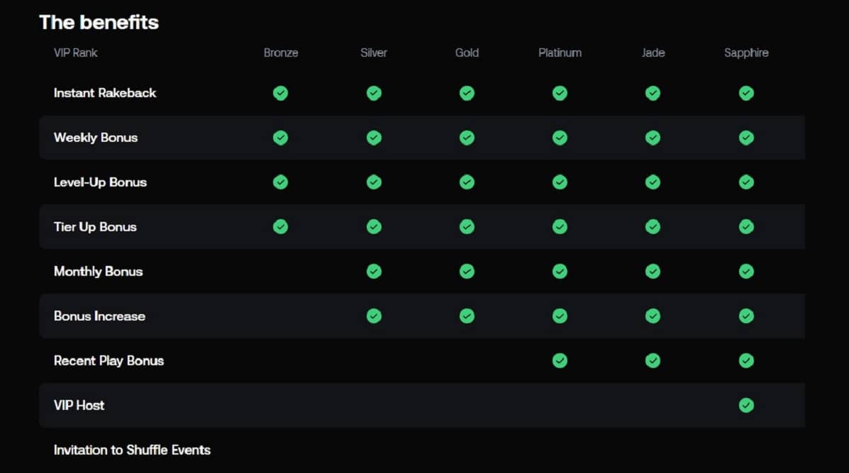 Most of the promos you can claim from Shuffle Casino come courtesy of its VIP and loyalty program or are short-term, time-based deals. Let’s start exploring their deals by looking at the loyalty scheme.